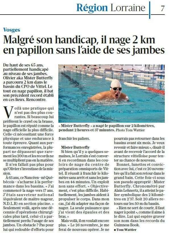 Mister-Butterfly a également nagé 2 km en papillon sans utiliser ses jambes.